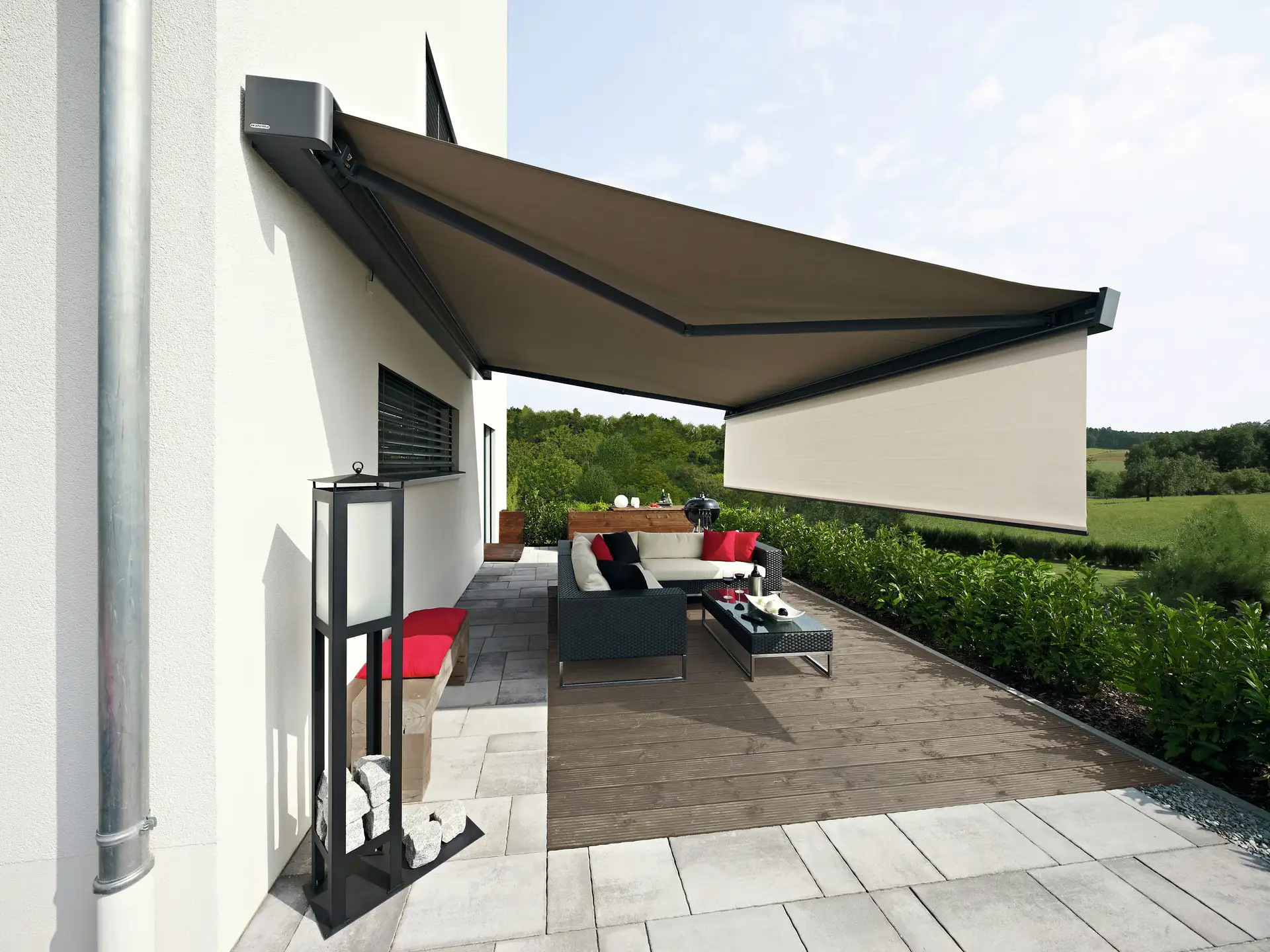 Moderne Terrassenmarkise mit stilvoller Einrichtung