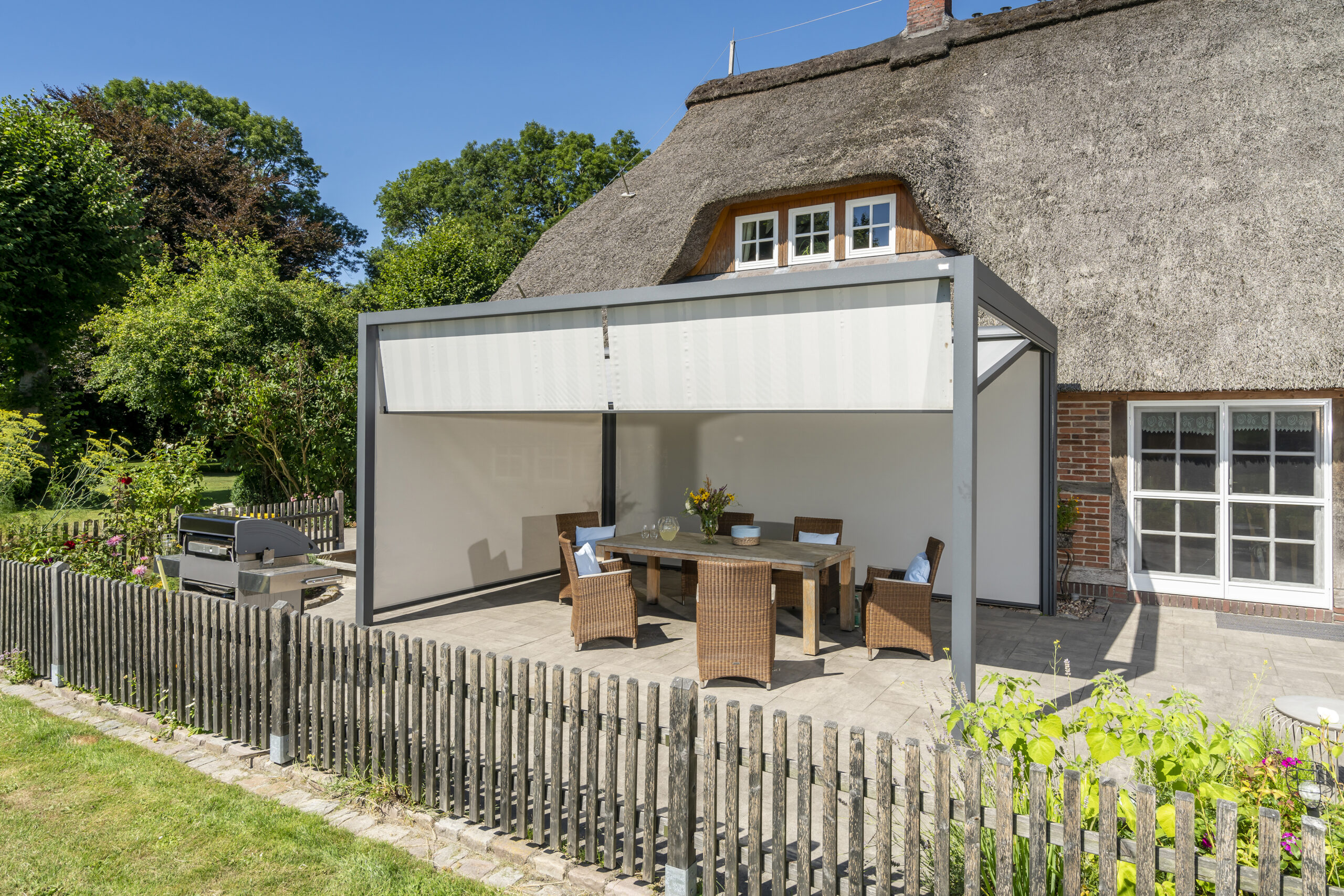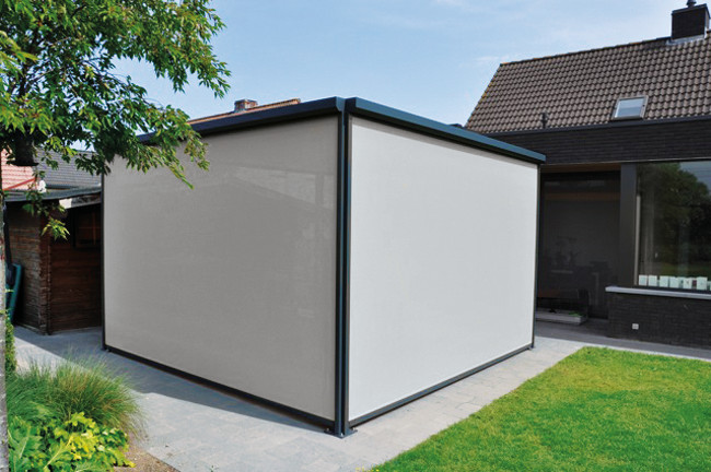 Quadratisch. Praktisch. Gut - So müsste man den Q.bus beschreiben. Egal ob freistehend oder an der Wand montiert, macht er im Garten eine gute Figur. Die geradlinige Konstruktion passt hervorragend zum modernen Baustil. Dank seiner patentierten Absenkmechanik sorgt der Q.bus bei Regen für eine ausreichende Neigung um das Wasser abzuleiten oder bei tief stehender Sonne ausreichend Schatten zu erzeugen. Optional kann man an beliebigen Seiten Senkrechtmarkisen anbinden - sogenannte Screens mit Zip-Führung. Dadurch erhält man einen zusätzlichen Sonnen- und Windschutz. Allseitig geschlossen wäre der Q.bus sozusagen das Zimmer im Freien. Ein besonderes Highlight ist die optionale integrierte LED-Beleuchtung. Warmweiße und per Fernbedienung dimmbare LED-Stripes in den Führungsschienen senken sich zusammen mit der Markise auf Knopfdruck ab und geben diesem Outdoor-Living-Room ein besonders gemütliches Ambiente. Und für etwas kühlere Abende lässt sich natürlich auch ein Infrarotheizstrahler an das System anbinden.